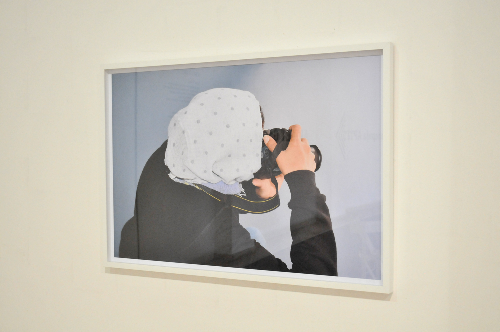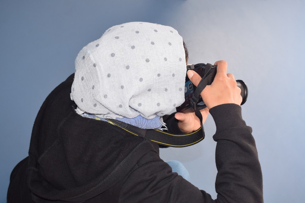 This migrant woman is not waiting for anyone, asking for anything. With a camera in her hands, she discovers an active role in her temporary environment. The observer is forced to think beyond the obvious and expected. Thus we read blue of an improvised photographic studio’s flat background as the blue of the sky, reading in what is missing – the narratives of freedom and boundless space which belongs to everybody. By changing the context and penchant for citation, the ‘meaning’ changes and the seeker becomes one of us.